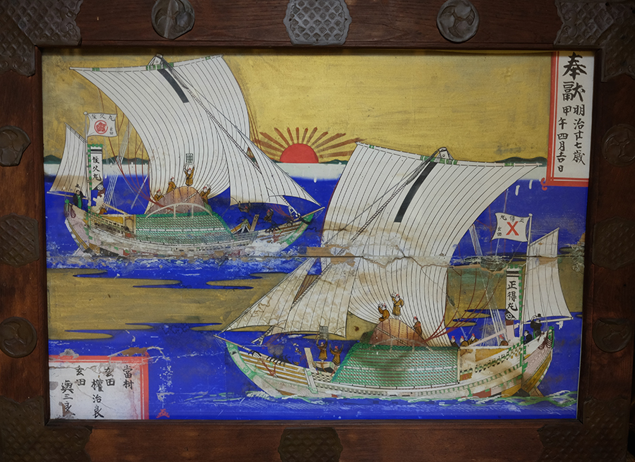 明治27年4月吉日、航海の安全を祈って奉納された奉納船絵馬には、明治初期に採用された洋式帆船型の正得丸と住久丸へ、米や大豆・